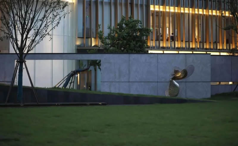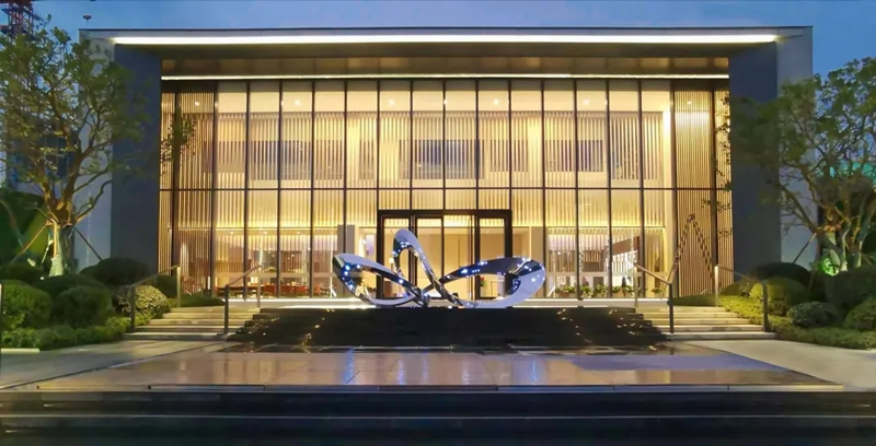 項目地以敔山之翼為設計理念,打造濃縮現代極簡美學的生活體驗館。設計師以“蝴蝶之翼”為主題,將示范區作為蝴蝶的專屬花園。蝴蝶元素的美好設定,產生積極的蝴蝶效應,為城市更添溫暖美好的氛圍。一步一歡喜,雕塑將給這座城市藝術花園帶來生命力。