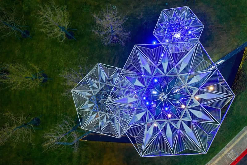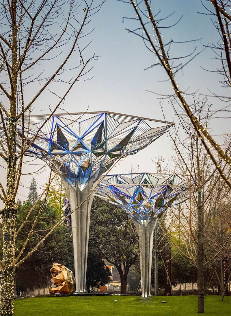 設計師用抽象的藝術形式,在繁華都市中打造一方凈土。以“樹”為型,以菱形與柵格元素為肌理,從空中鳥瞰,離心式發射狀的構筑物,如同茂盛的樹冠。加上熊的造型:或在“樹”下休憩,擬人化的形態拉近了與行人之間的距離;或正在攀爬,四周的景色一覽無余,攀爬中的熊,隱射著人類自古以來對于天空的遐想。