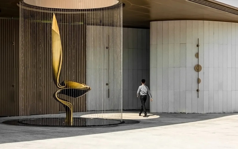 太湖東臨蘇州,溫和多雨,是天上落下的銀盤,湖中常見的漁船,既是江南漁民的經濟命脈,也是一處不可忽略的美景。設計師靈感來源于太湖的水波蕩漾,將精致與自然的詩意相融合,同時考慮到場地空間位于水簾內部,纖長的造型可將狹小的空間拉長,增加靈動性,設計出城市山水空間與現代意境結合的藝術作品。