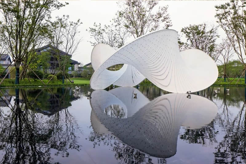 雕塑設置在水景之上,設計師在構思設計之前對有限的空間和特殊的地理條件進行思考和推敲。結合“綢都”蘇州的本土文化特征,提取“絲綢”和“水鄉”作為抽象設計語言,打造出柔美靈動的藝術作品。