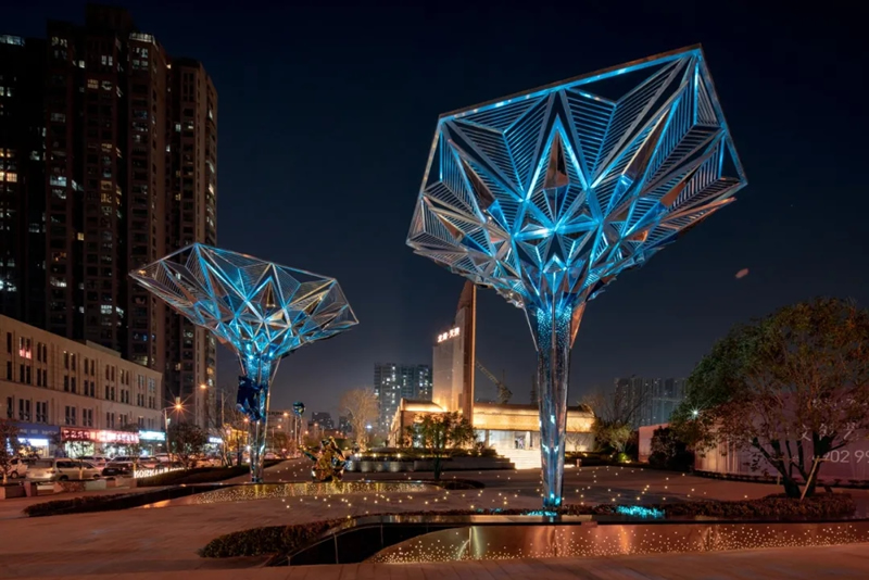 利用折面呈現多棱角反射周圍的景觀環境,呼應開放多元化的文化氛圍,巧妙重組了現代裝置材料,以通體鏡面解構并呈現了空間,更將原空間的靈動、雅致進行再次詮釋衍射,鏡面映照出熙熙攘攘川流不息的過路者,為鏡面中所反射的景象增添了動感和變化。身置其中,仿佛得到了片刻的寧靜,燈火輝煌,正是一道亮麗的風景線。