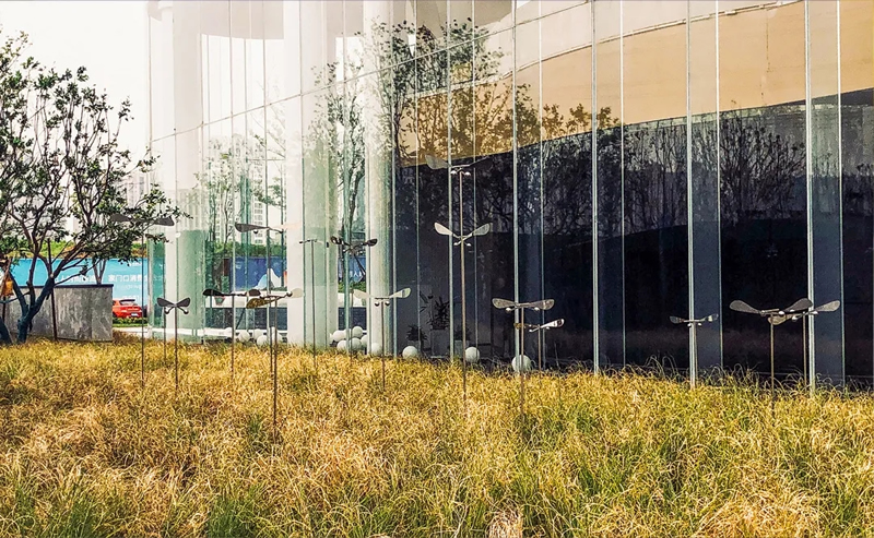 后場雕塑為了激活空間、強化主題,選擇了蝴蝶“飛舞”和“停歇”的幾個狀態進行創作。一靜一動,兩相宜。