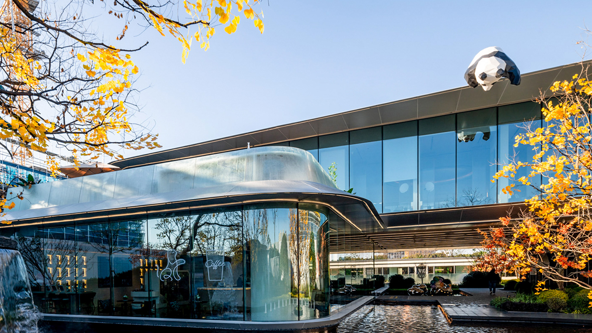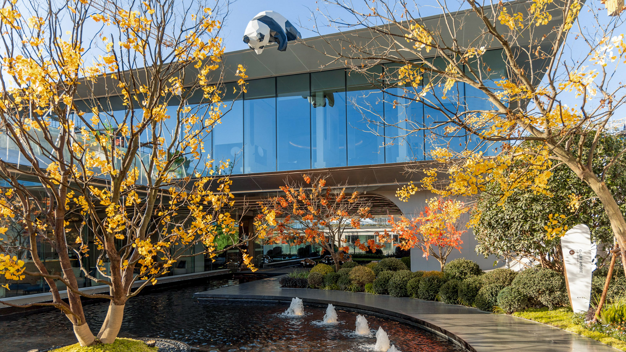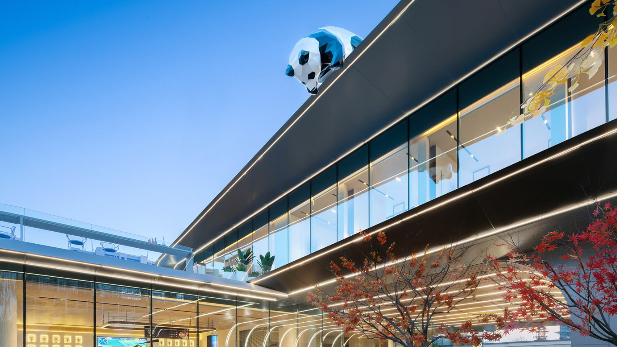 在建筑物前能夠直觀的看到這只探出屋頂的折面熊貓,