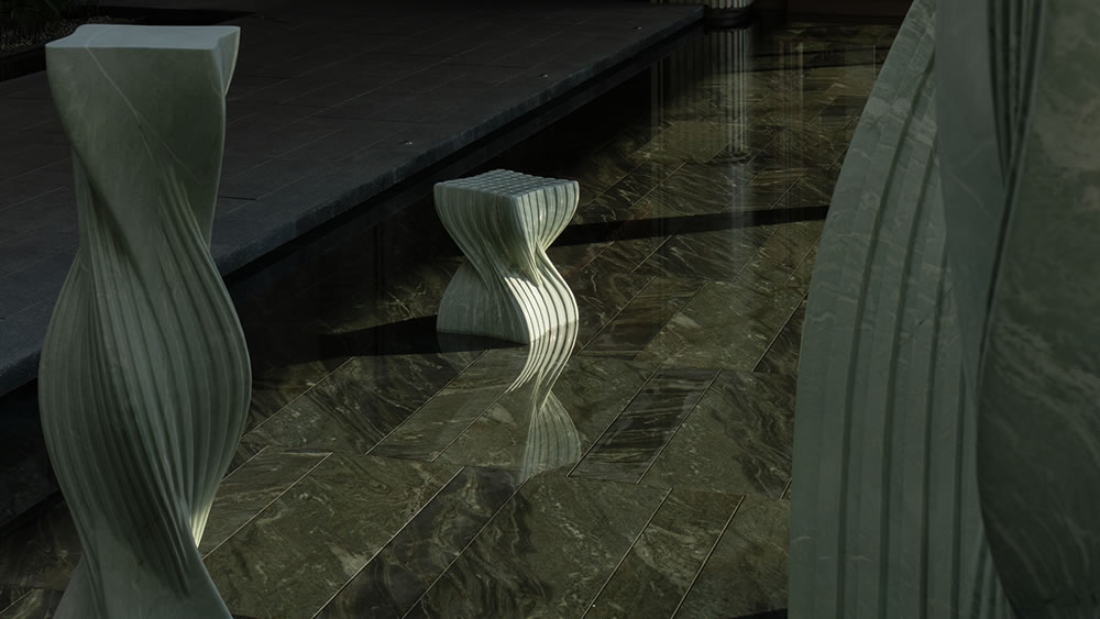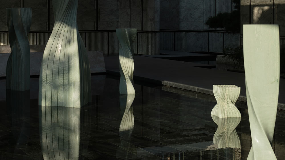 形成流動的虛影,讓堅硬的材質呈現水的柔漾,