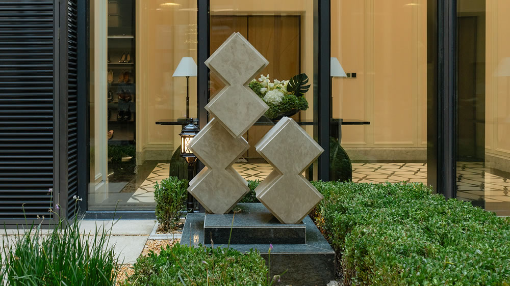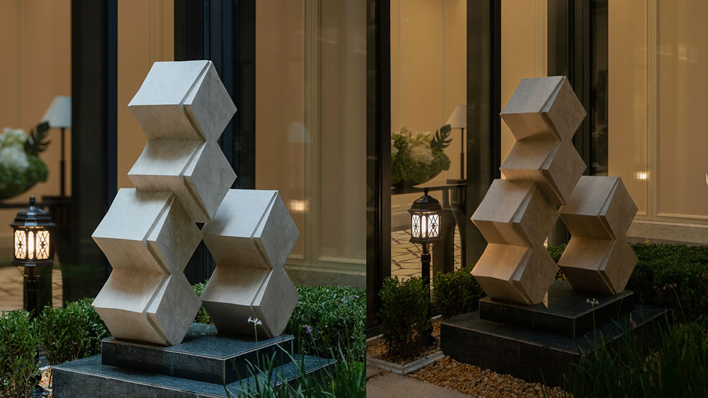 以"六合"為概念,六個菱形結構層疊交錯而成, 形成一種仿佛無限延伸的空間幻覺。 光線從縫隙中滲透,如同穿越時空的隧道, 連接地與天、暗與光。